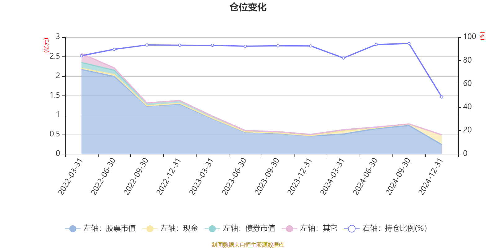 据定期报告数据统计,近三年平均股票仓位为87.5%,同类平均为83.34%。2024年三季度末基金达到94.56%的最高仓位,2024年末最低,为48.81%。