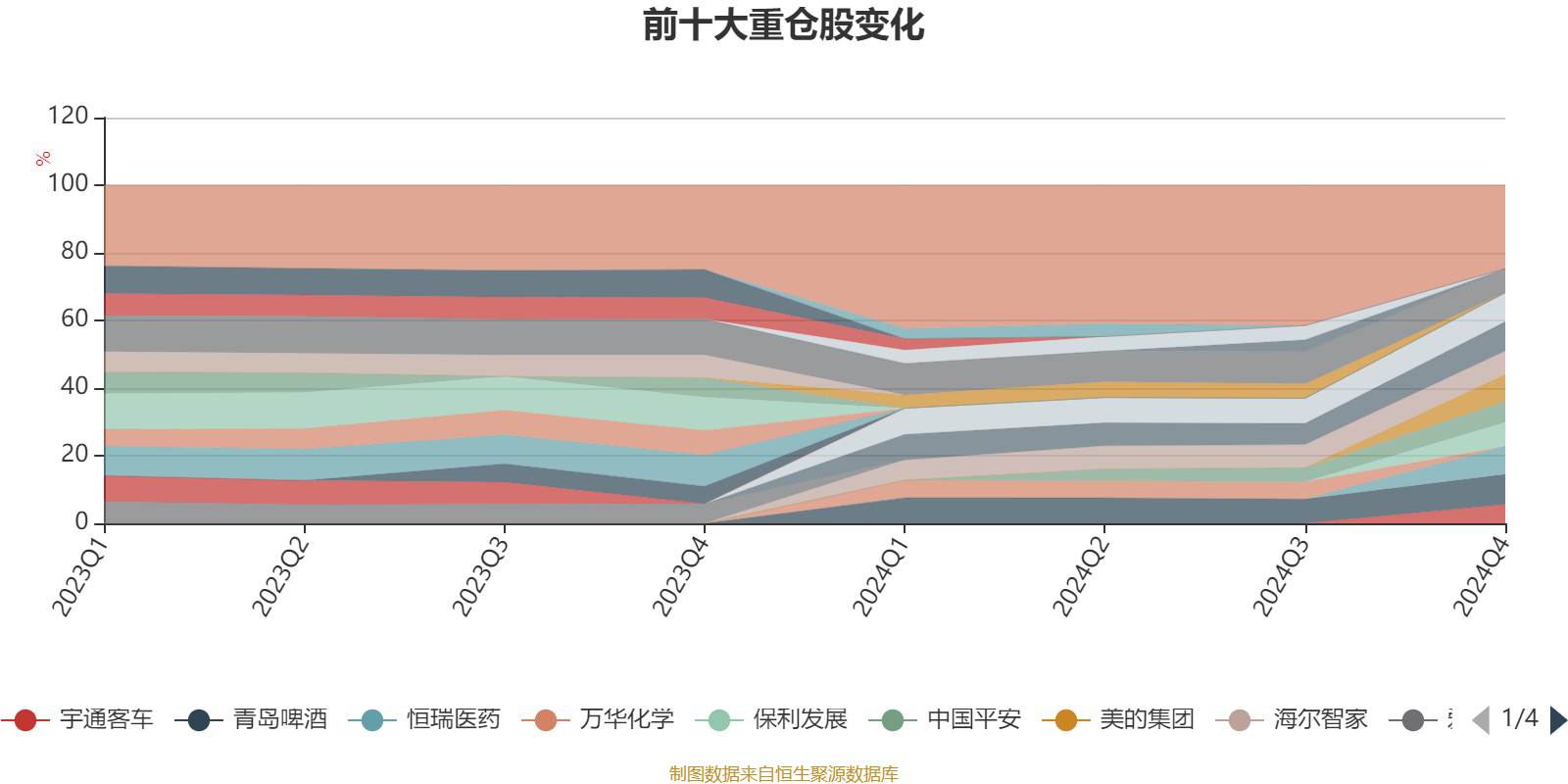 该基金持股集中度较高。截至2024年末,基金十大重仓股分别是青岛啤酒、伊利股份、山西汾酒、恒瑞医药、美的集团、保利发展、海尔智家、贵州茅台、中国平安、宇通客车。